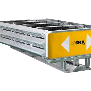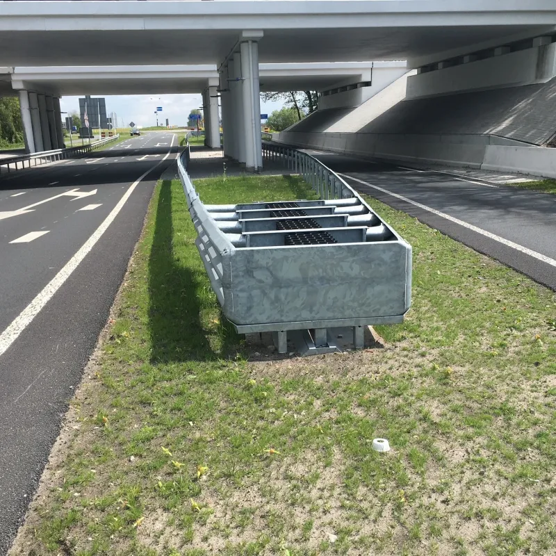 Thanks to an efficient patented energy absorption system consisting of special metal honeycomb panels, we deliver the best performing crash cushions. In the event of a collision, these honeycomb absorbing modules ensure an almost even absorption of the kinetic energy during the entire deformation of the crash cushion. This minimizes the risk of injury or worse. Leonidas crash cushions are delivered fully assembled, making installation quick and easy. We supply tailor-made connections to connect seamlessly to the guardrail. Thanks to the modular construction, damage can be repaired quickly and easily after a collision, often on site. Parts of this terminal are up to 80% reusable and 100% recyclable. This way, huge savings can be made on the costs of damage repair.