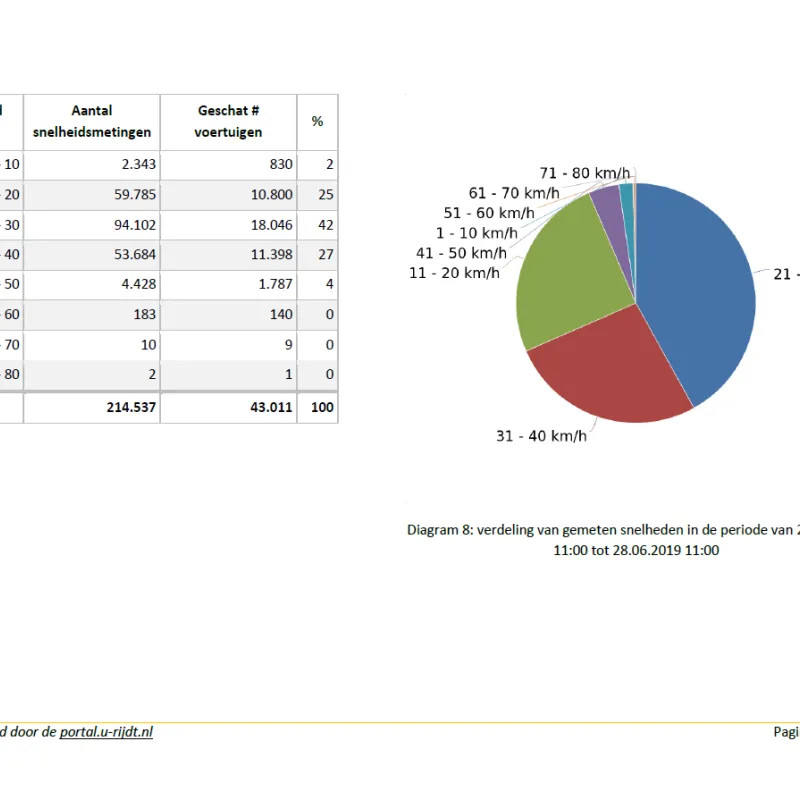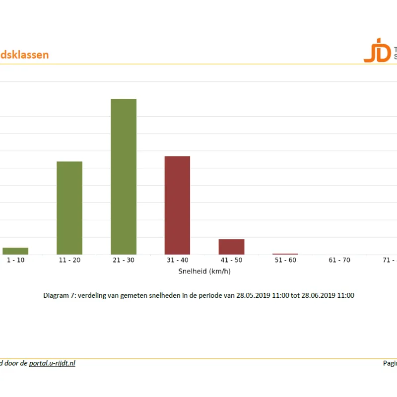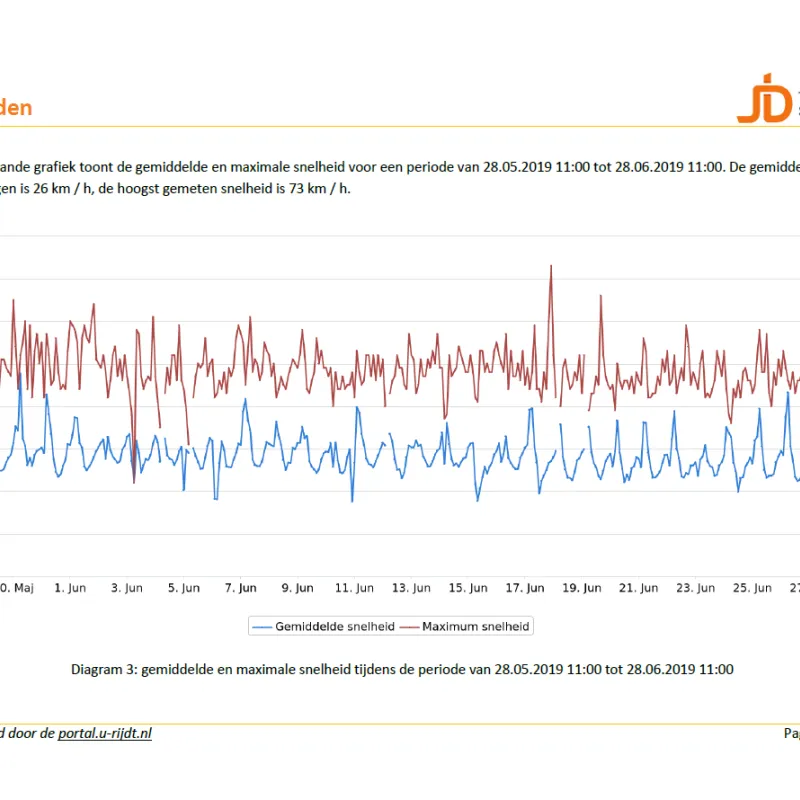 Via the portal www.u-drives.nl you can easily manage your speed display online and traffic analysis request reports. This gives you a clear picture of the traffic flows. Via the portal you can see the GPS locations of the speed displays and log in directly to request the status and/or change settings. The locations are clearly displayed on the Google Maps map. With an up-to-date traffic analysis report you get a clear picture of the traffic situation at the measurement location. This report shows the estimated number of vehicles or traffic load, average and maximum speed, speed percentile value and distribution of speed measurements in up to 10 speed classes.