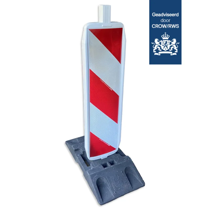 To work safely on or along the road, our guidance delineators are used daily during road works. Whether it concerns a highway closure or marking a dangerous situation, our guide beacons are very suitable for this. Our guidance beacons comply with the new guidelines 96a and 96b 2020 of the C.R.O.W. and are equipped with high-quality retro-reflective film class 3. Our guidance beacons are reversible and equipped with 2 adapters of 60 mm. and therefore fit into every type and brand of base. Our UV-resistant plastic guidance beacons are supplied in white as standard and are available in any color upon request. The stacking lugs on the top and bottom of the beacons make it easy to stack the beacons. The retro-reflective film is flush mounted, so that the film is less likely to be damaged.