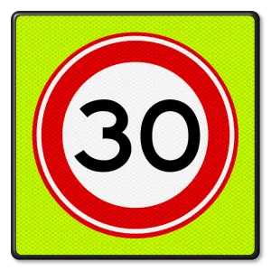 Official traffic sign RVV A01-30f fluorescent speed sign indicates the maximum permitted speed of 30 kilometers per hour. So road users know that they are not allowed to drive faster than the specified maximum speed of 30 km per hour.