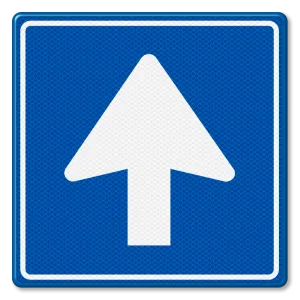 Official traffic sign RVV C03 one-way road indicates that driving in this direction is allowed. This sign is placed opposite the side road of a T-junction, when there is one-way traffic on the main road. This traffic sign C03 is always used in combination with traffic sign C02 so that the driver knows at the end of the road that it is a one-way road.