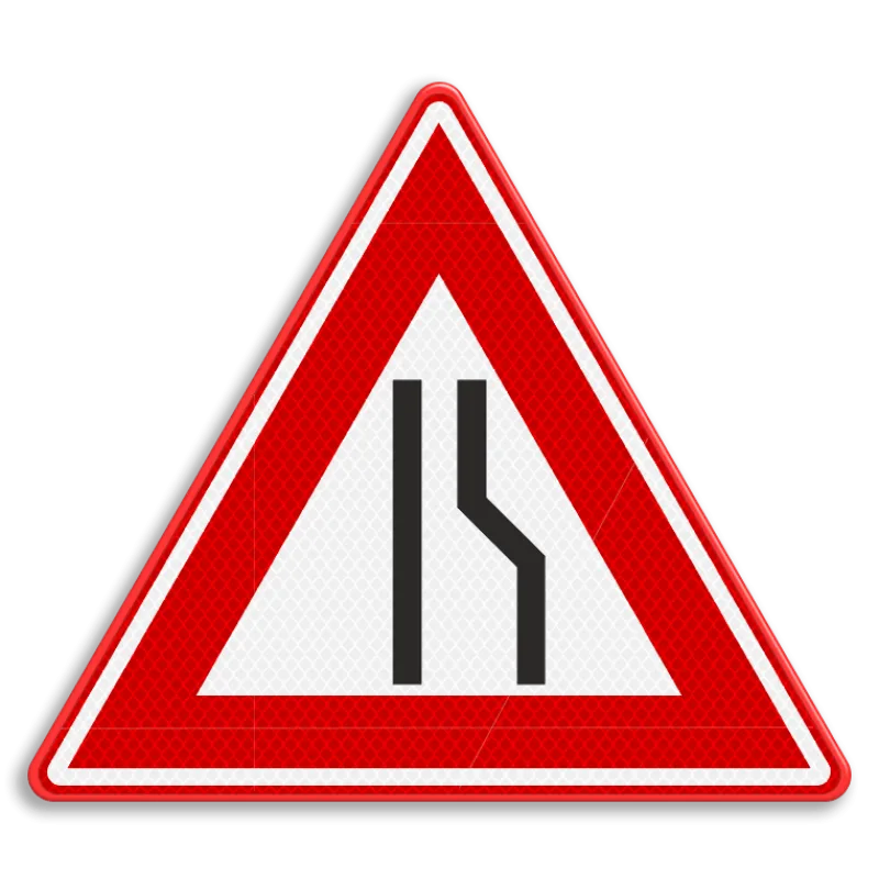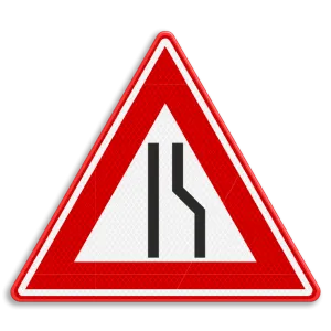 Official traffic sign RVV J18 gives a warning for approaching a lane narrowing to the right. After passing this sign, road users know that they have to pay attention and adjust their speed. On the right side of the road there will be a narrowing with an obstacle.