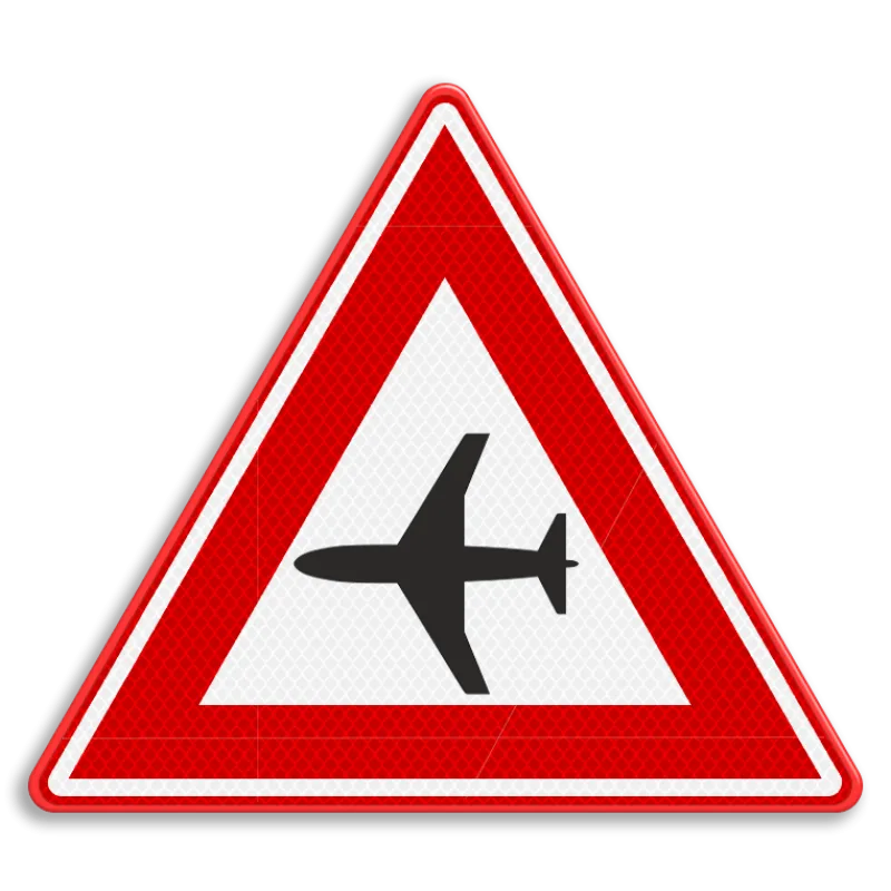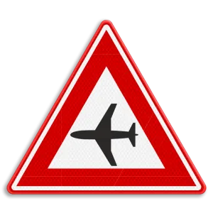 Official RVV J30 traffic sign warns for low-flying aircraft. After passing this sign, road users know that they are entering a zone where aircraft can fly low over.