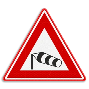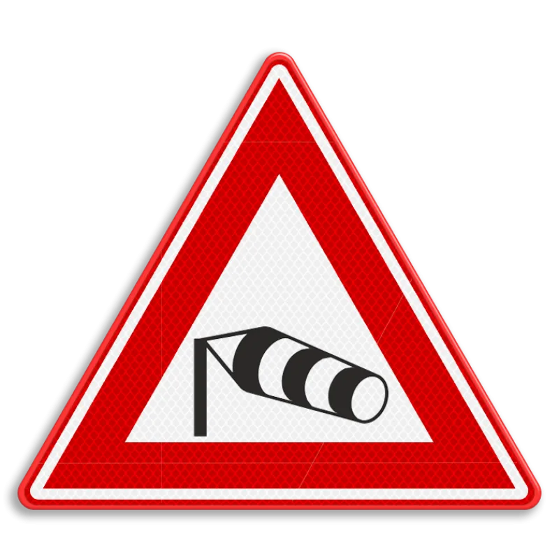 Official traffic sign RVV J31 gives a warning for a dangerous crosswind. After passing this sign, road users know that they are entering an open zone where strong crosswinds can occur.