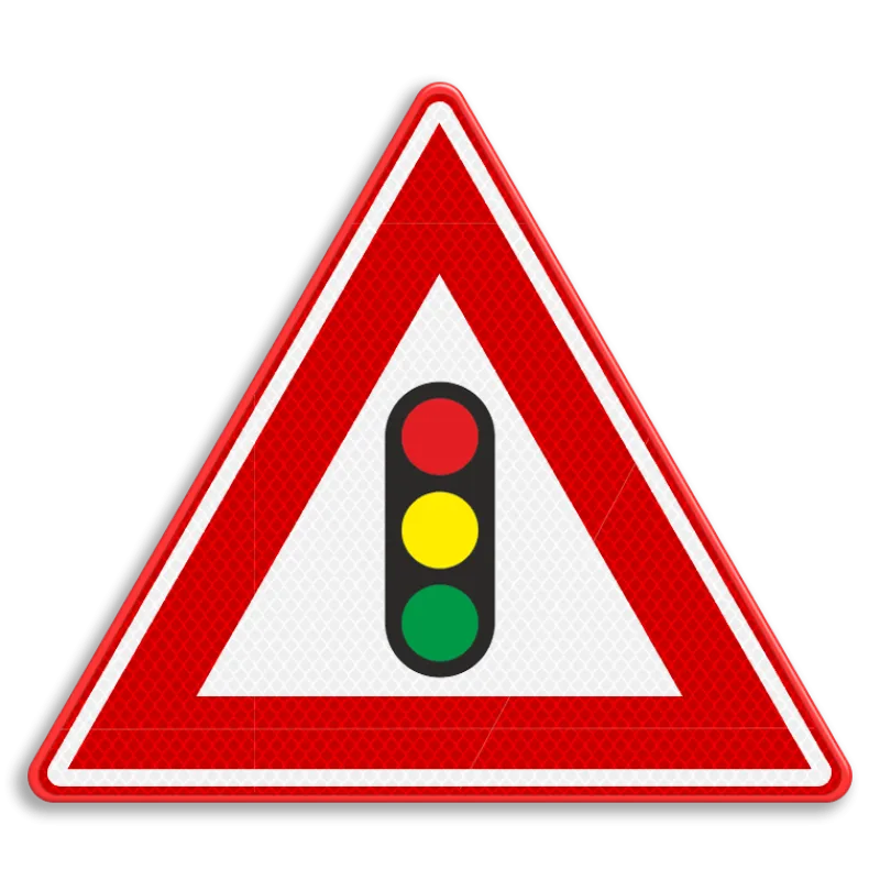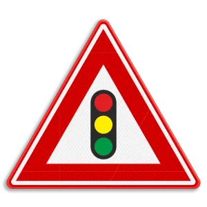 Official traffic sign RVV J32 gives a warning for approaching traffic lights. After passing this indication, road users know that an intersection or bridge with traffic lights is approaching.