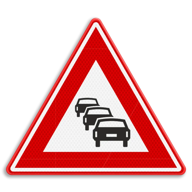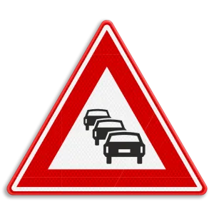 Official RVV J33 traffic sign warns of an increased risk of traffic jams. After passing this indication, road users know that they are entering a zone where traffic jams occur with some regularity.