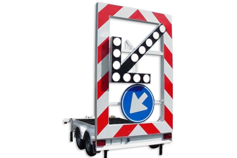 Onze pijlwagens zijn zo uitgebalanceerd dat men rijdend, tot een snelheid van 90 km/u, het actieraamwerk veilig op en neer kan bewegen. Een draaibare en duidelijk zichtbare verlichte pijl in LED uitvoering geeft de rijrichting aan. Eventueel kan een energiezuinige matrixpijl in het actieraamwerk worden gemonteerd zodat de actiewagen ook inzetbaar is als verdrijf- en splitsingswagen. De verlichte pijl is goedgekeurd volgens EN12352 klasse L8H. Voor een zeer stabiele afstempeling zijn op de hoeken van het chassis hydraulische steunpoten gemonteerd.