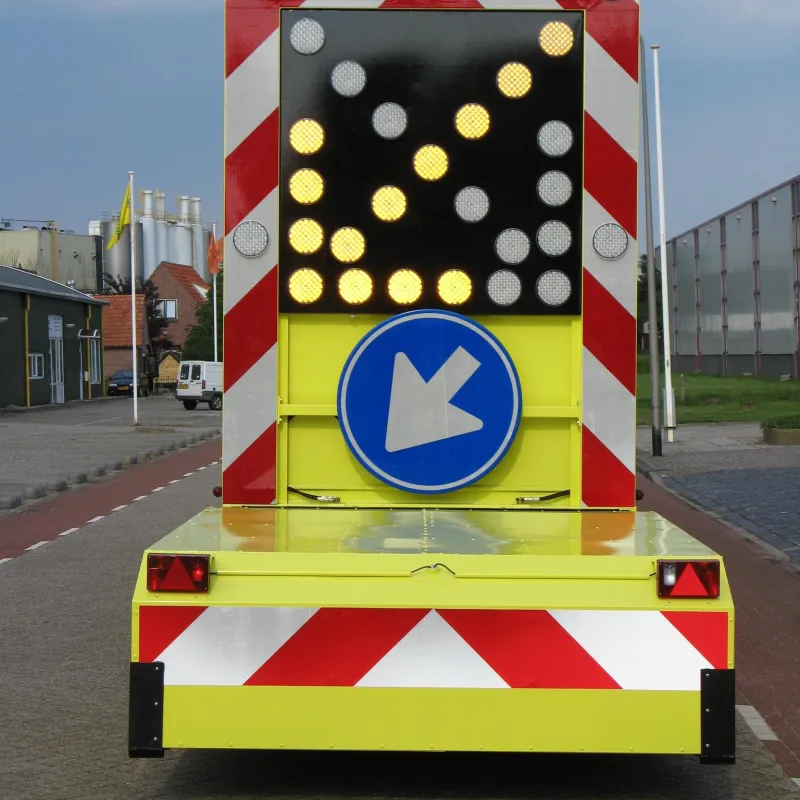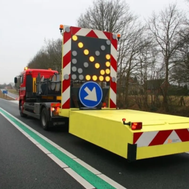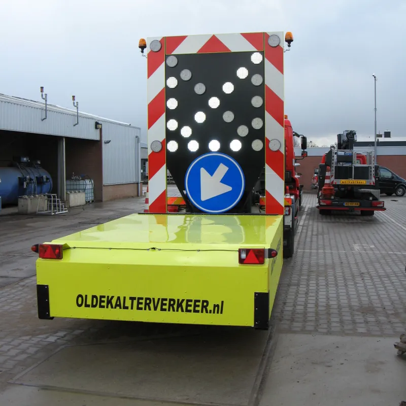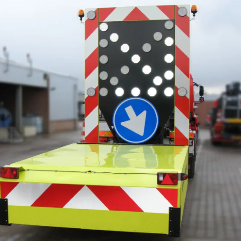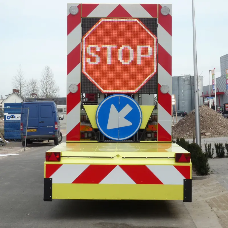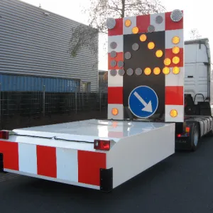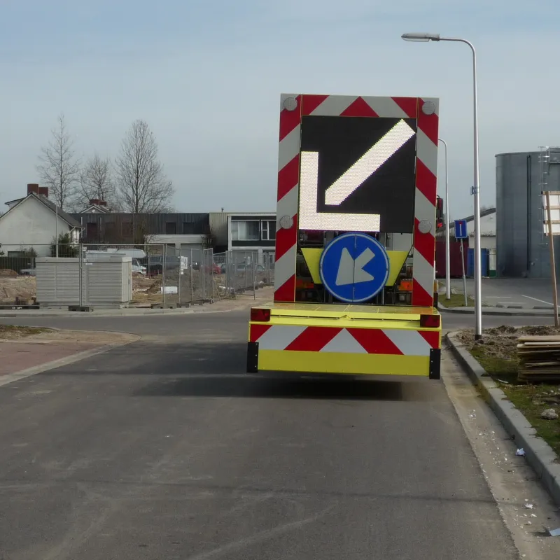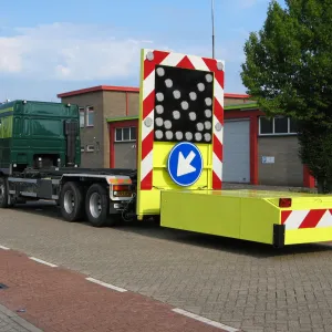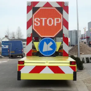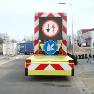 Maak de Botsabsorber multifunctioneel inzetbaar met een full color LED Display. Met een LED Display kunnen zowel de pijlen links en rechts alsook de chevron pijlen en splitsingspijlen getoond worden. Op niet autosnelwegen kan het verkeersbord RVV F05 op het LED Display worden getoond. Tevens is de botsabsorbeerder inzetbaar als tekstkar waarmee weggebruikers duidelijk geïnformeerd worden over de actuele verkeerssituatie. Het energiezuinige en vrij programmeerbare full color led display kan eenvoudig worden geprogrammeerd vanuit de cabine van de vrachtwagen maar ook op afstand via ons portal VMS Control. Uiteraard voldoet het LED Display aan de Europese Standaard voor Variable Message Traffic Signs NEN-EN 12966-1:2005+A1:2009