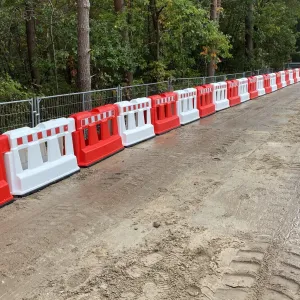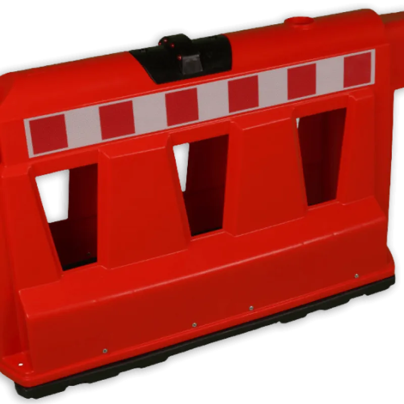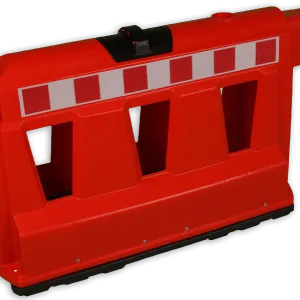 Deze kunststof barrier onderscheidt zich ten opzichte van de huidige barriers door zijn gebruiksvriendelijkheid en extra opvallende design. De verkeersbarrier heeft 8 rode glasparels bovenop met rood/wit geblokte folie klasse 1 aan de zijkant dat voor extra verkeersgeleiding zorgt. Door het stapelbare ontwerp bespaar je veel ruimte tijdens het transport.