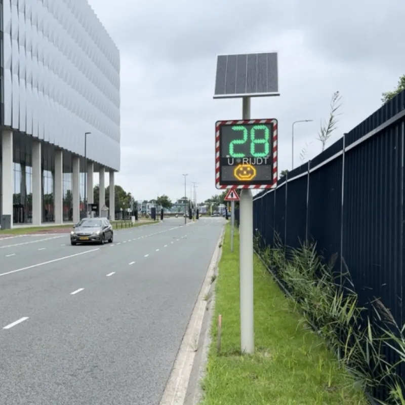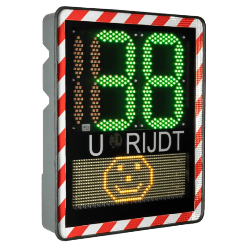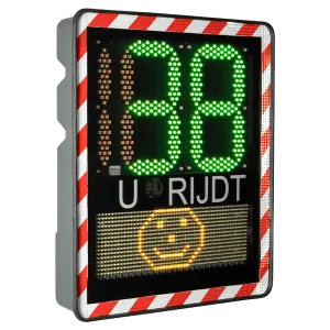 Dit LED snelheidsdisplay I-SAFE 2 detecteert de snelheid van de automobilist bij het tegemoet komen rijden van het bord. Houdt de automobilist zich netjes aan de snelheid dan wordt zij gecomplimenteerd met een vrolijke smiley. Rijdt de automobilist te hard dan wordt de snelheid knipperend in het rood getoond om aan te geven dat zij haar snelheid moet verlagen.