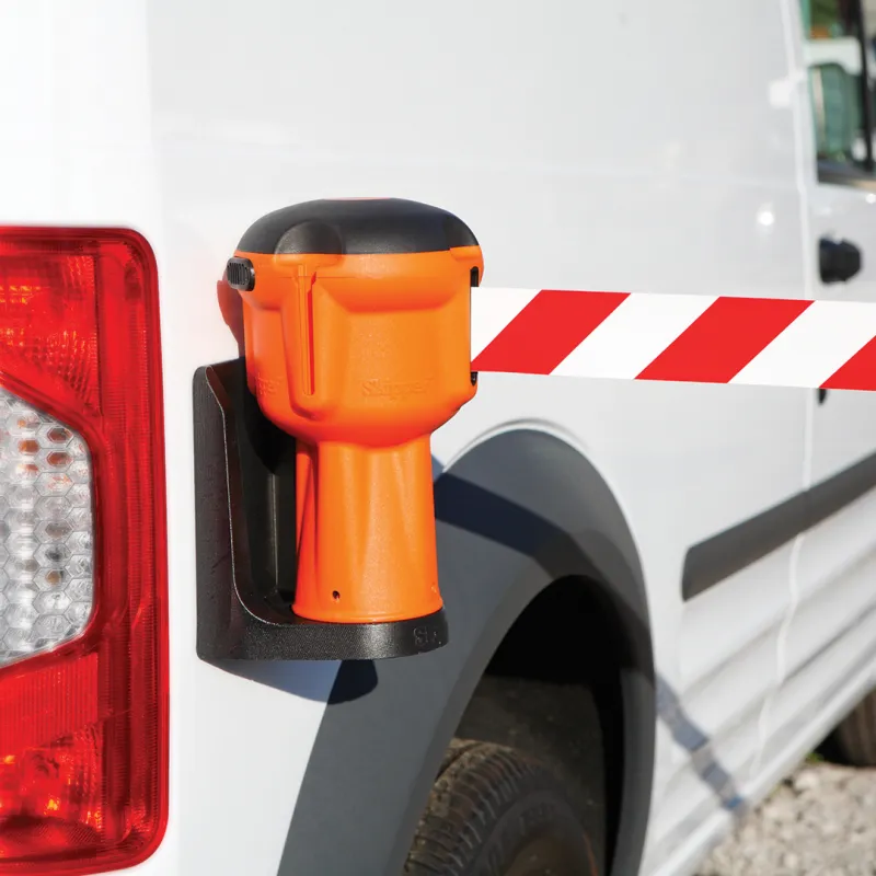 Met deze wandhouder kunt je snel een zone markeren of afzetten, omdat geen afzetkegel of afzetpaal nodig is om de afzetlinthouder vast te maken. Plaats de Skipper afzetlinthouder op deze wandhouder, en verbind het uittrekbare afzetlint met de volgende afzetlinthouder om het gewenste gebied af te bakenen. De wandsteun kan met schroeven eenvoudig worden gemonteerd dankzij de voorgeboorde gaten in de houder. Deze wandsteun is ook leverbaar met magneten zodat de houder vast gemaakt kan worden aan bijvoorbeeld een voertuig of aan een ander magnetisch oppervlak. Op deze wandhouder kunnen alle Skipper afzetlinthouder modellen worden vastgezet. Deze houder is ideaal voor terreinen die regelmatig afgezet moeten worden. De Skipper afzetlinthouder kan permanent op deze wandsteun blijven zitten. Als het terrein afgezet moet worden dan neem je het afzetlint uit de oprolautomaat en verbind deze met een Skipper zuignaphouder of magnetische houder.