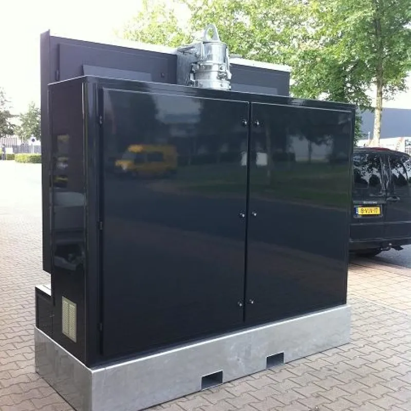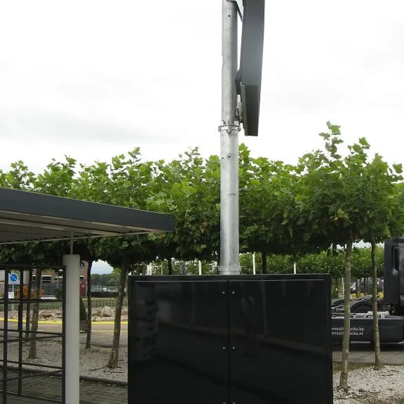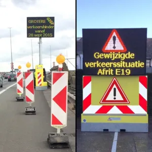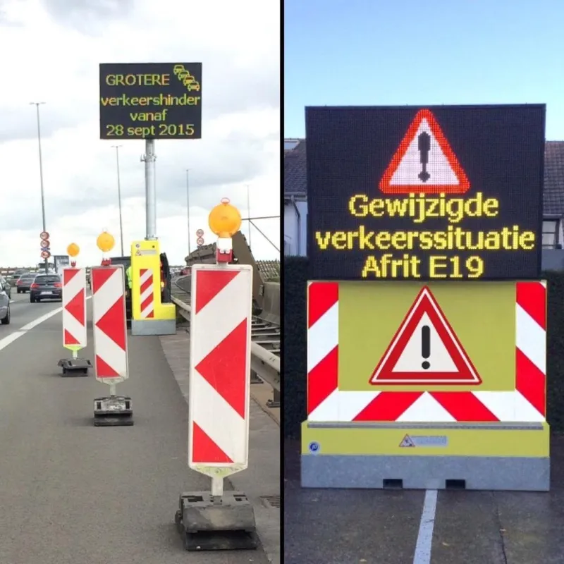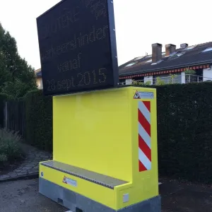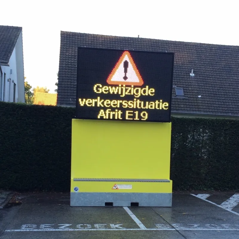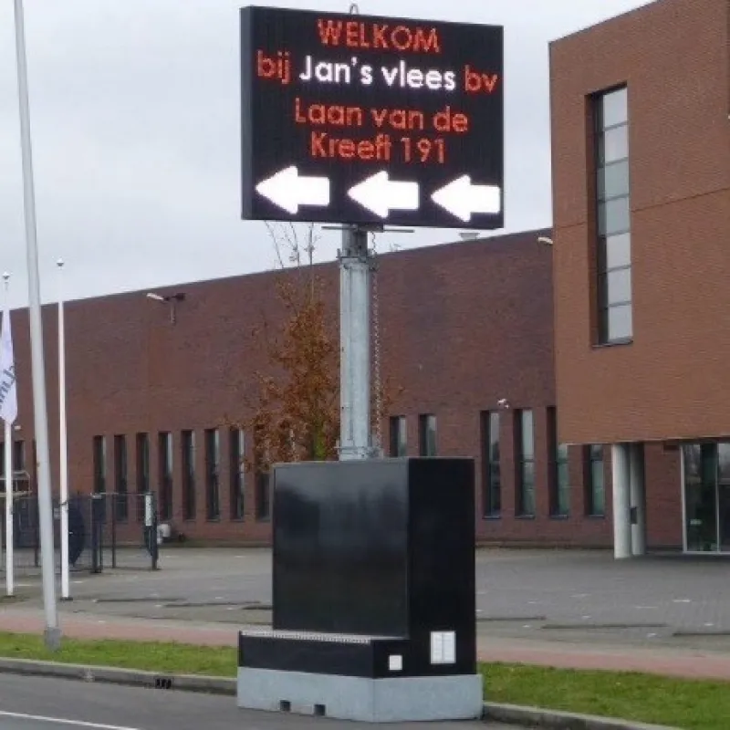 Onze Mobiele BermDRIPs - Mobiel Informatiepanelen zijn voorzien van briljante energiezuinige LED Displays die via onze Internet applicatie VMS Control eenvoudig zijn te traceren en te programmeren. Het LED Display is met een verstelbare kantel constructie gemonteerd tegen de telescoop mast. Het zeer energiezuinige LED Display voldoet aan de eisen van Rijkswaterstaat en de Europese Norm EN12966. De telescoopmast kan naar wens vol hydraulisch of met een kraan in- en uitgeschoven worden. Het Mobiele Informatiepaneel is voorzien van een zeer stabiele en robuuste basis die gebruik tot windkracht 8 garandeert. Op de basis hebben wij een speciale behuizing ontwikkeld met grote deuren waarin de energievoorziening en de bediening zijn gebouwd. Een ingebouwde trap maakt het mogelijk om eenvoudig en veilig op de behuizing te klimmen om eventueel het Informatiepaneel / LED Display in de juiste stand te draaien of service uit te voeren. Ingeschoven maakt het display onderdeel uit van de behuizing. Zo ontstaat een compacte mobiele BermDRIP die aan het hijs-oog boven op te telescoopmast of met een heftruck eenvoudig opgepakt kan worden. Het compacte design biedt de mogelijkheid om meerdere Mobiele BermDRIP's tegelijk te transporteren. OPVALLEND VEILIG!