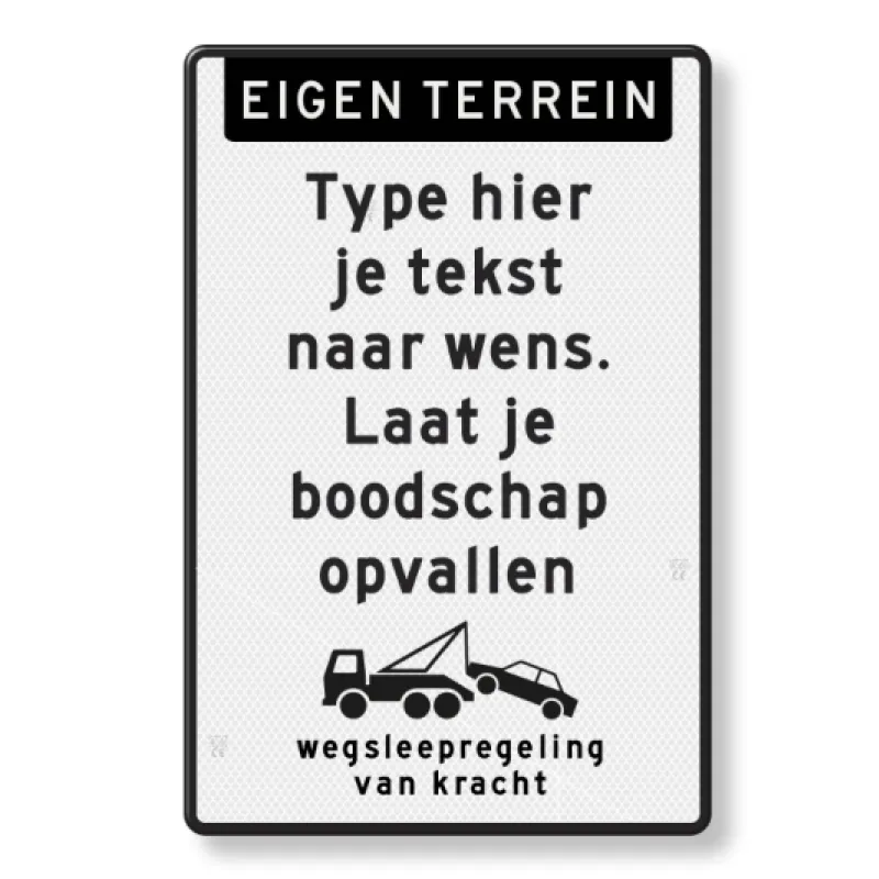 Tekstbord eigen terrein, eigen tekst, wegsleepregeling, zwart/wit