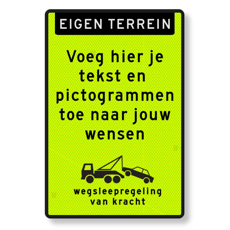 Tekstbord eigen terrein, eigen tekst, wegsleepregeling, FLUOR