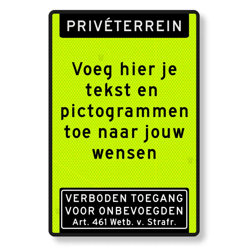 Kenmerken tekstbord priveterrein, eigen tekst, art. 461, FLUOR