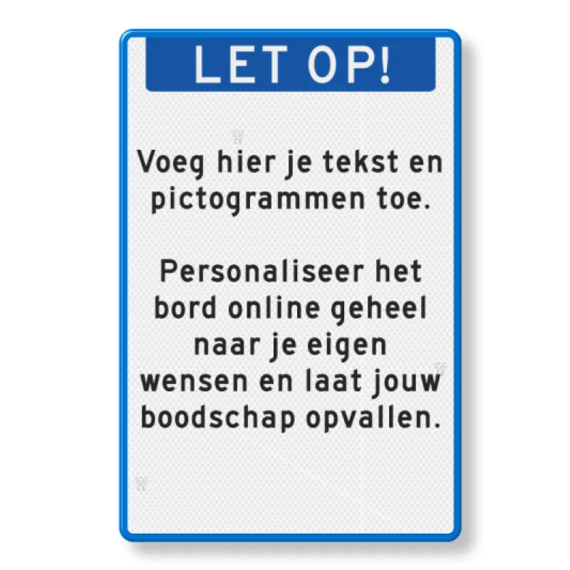 Dit officiële aluminium tekstbord wit reflecterend met dubbel omgezette rand (DOR) ontwerp je eenvoudig in onze SignCreator. Personaliseer het bord online geheel naar je eigen wensen en laat jouw boodschap opvallen.