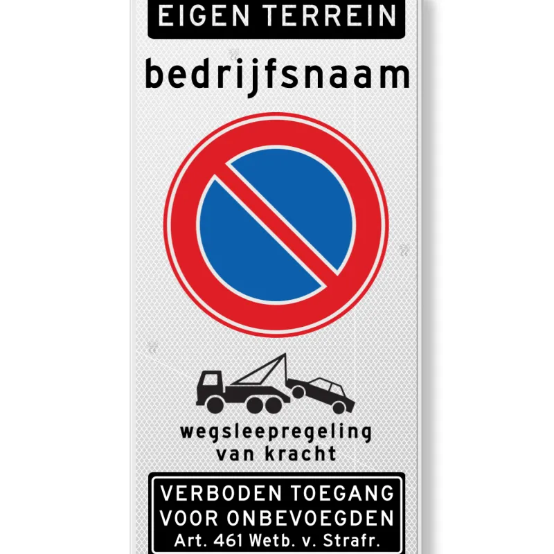 Verkeersbord eigen terrein, bedrijfsnaam, parkeerverbod