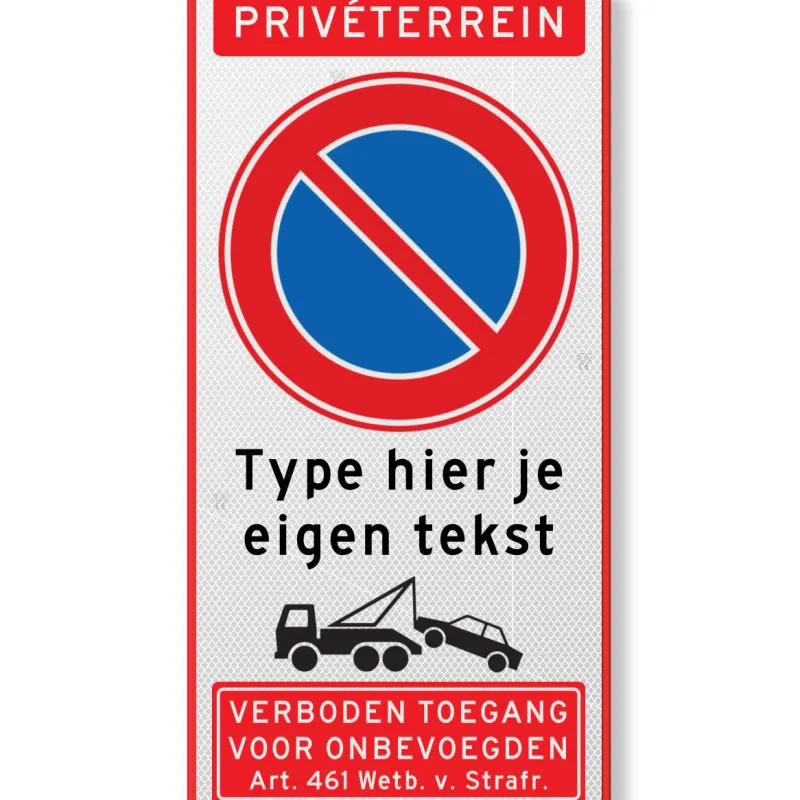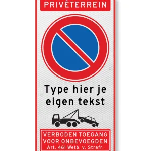 Verkeersbord privé terrein, RVV E1, eigen tekst, wegsleepregeling, verboden toegang