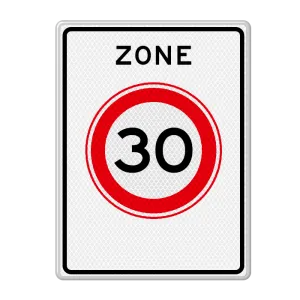 Officieel verkeersbord RVV A01-30zb begin zone 30 bord geeft de maximum toegestane snelheid van 30 kilometer per uur aan in een bepaalde zone. Zo weten weggebruikers dat ze niet harder mogen rijden dan de aangegeven maximum snelheid van 30 km. Het verkeersbord 30 kilometerzone is geldig tot het einde zone bord.